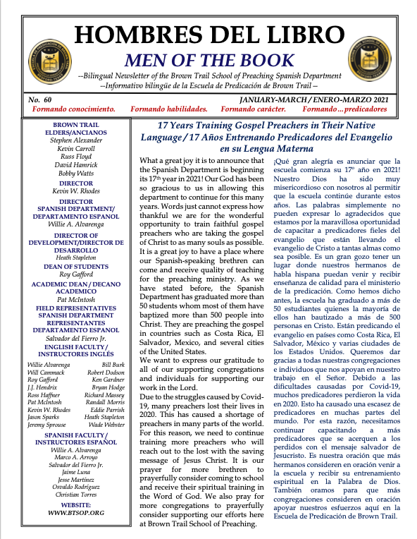 Please take a few moments to read our most recent newsletter for the Brown Trail School of Preaching Spanish Department. As we continue to face this pandemic virus, please continue to keep the work of the school in your prayers. We still need preachers to preach the Gospel of Christ, because we still have souls that need to learn about the Gospel.