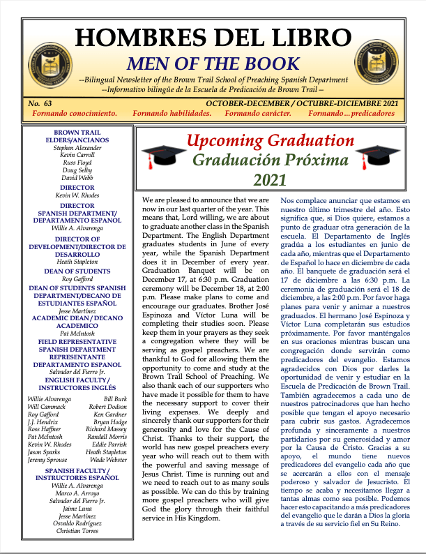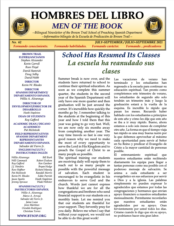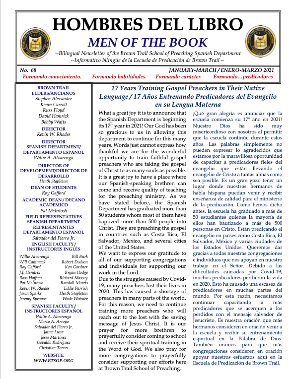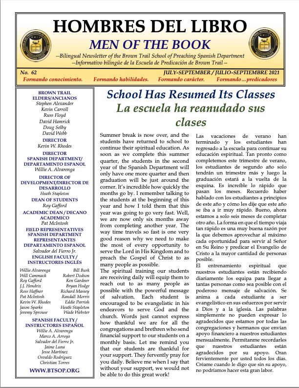 We invite you to please read our recent newsletter for the Brown Trail School of Preaching Spanish Department. Please continue to keep in your prayers this much-needed work.